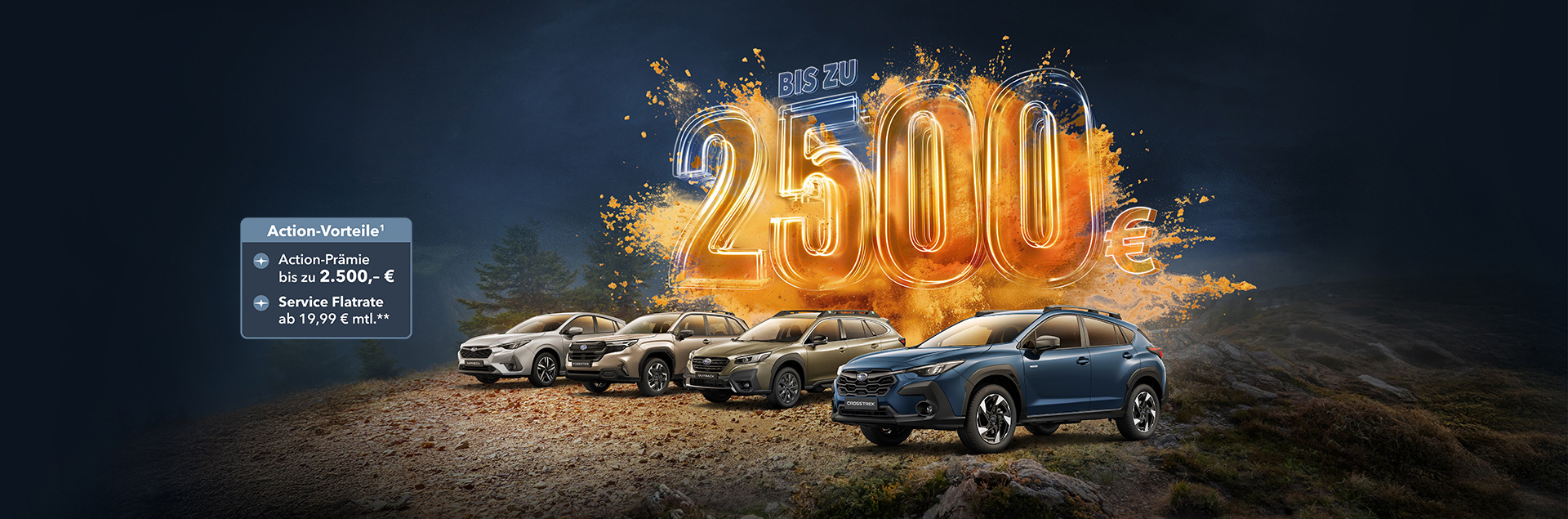 1 Die Aktion gilt vom 01.07.2025 bis 30.09.2025 in Verbindung mit dem Kauf eines aktuellen Subaru Impreza, Crosstrek, Outback oder neuen Forester (Modelljahr 2025) (Neu- oder Vorführwagen), Zulassung/Besitzumschreibung bis 31.12.2025 bei teilnehmenden Subaru Partnern. Die Aktion wird gemeinsam von der SUBARU Deutschland GmbH und den teilnehmenden Subaru Partnern getragen und ist nicht mit anderen Aktionen der SUBARU Deutschland GmbH kombinierbar mit Ausnahme des Aktionsangebots zur Service-Flatrate. Sie sparen je nach Modell bei Kauf eines Subaru Crosstrek oder Impreza (MJ 2024): 2.500,-€, eines Crosstrek oder Impreza (MJ 2025): 1.200,-€, eines Outback (MJ 2024): 1.000,-€; eines Outback (MJ 2025): 2.000,-€, oder eines neuen Forester (MJ 2025): 1.000,-€. Weitere Detailinformationen erhalten Sie bei Ihrem teilnehmenden Subaru Partner oder unter www.subaru.de.
