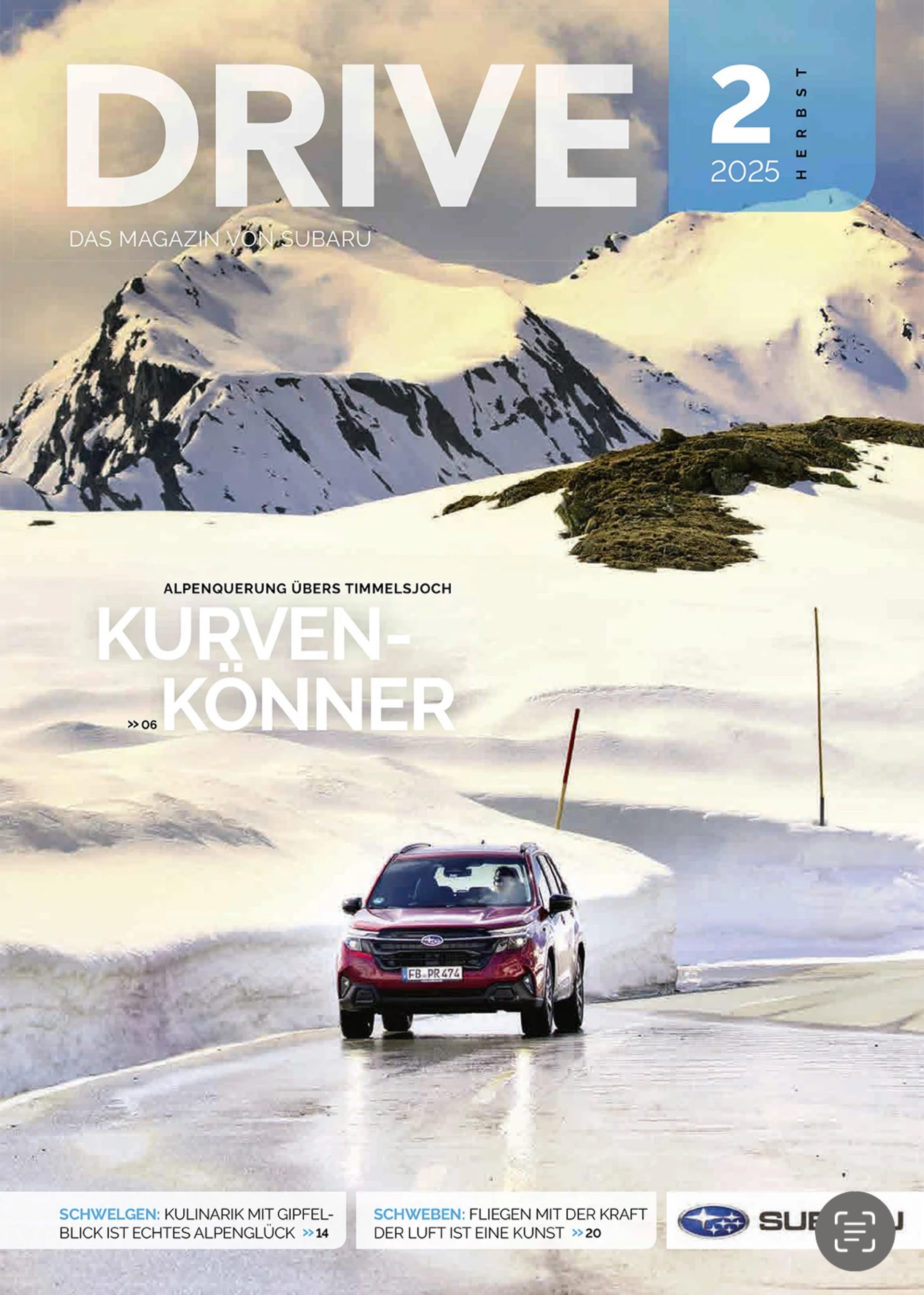 Diese Ausgabe der DRIVE bringt sie in himmlische Höhen: Hoch über Innsbruck lädt die Arzler Alm zu kulinarischen Höhepunkten; die Gastwirte hält dabei ein vollelektrischer Subaru mobil. In Baden-Baden schrauben sich Segelflieger mit der Kraft der Luft bis an die Wolken. Und in der neuesten Generation des Subaru Flaggschiffs überquert das DRIVE-Team Kehre um Kehre die eindrucksvolle Timmelsjoch-Hochalpenstraße. Dass der SUV nicht nur mehr Onroad-Komfort bietet, sondern auch bei den Offroad-Fähigkeiten zugelegt hat, testen wir im tiefen Matsch und auf steilen Hohlwegen. Das Magazin DRIVE liefert zudem eine exklusive Premieren-Vorschau auf drei neue vollelektrische Modelle, die mit stärkeren Motoren, mehr Reichweite, schnellerem Aufladen und einer höheren Anhängelast ein Ausrufezeichen setzen. Apropos: Im Rahmen unserer Umfrage würden wir gerne Ihre Meinung rund um die E-Mobilität erfahren und bedanken uns für die Teilnahme mit einem Gewinnspiel. Lesen Sie jetzt die neueste Ausgabe des Subaru Magazins DRIVE, das wir Ihnen als gedrucktes Heft kostenfrei nach Hause liefern. Oder besuchen Sie uns online auf: www.subaru-drive.de